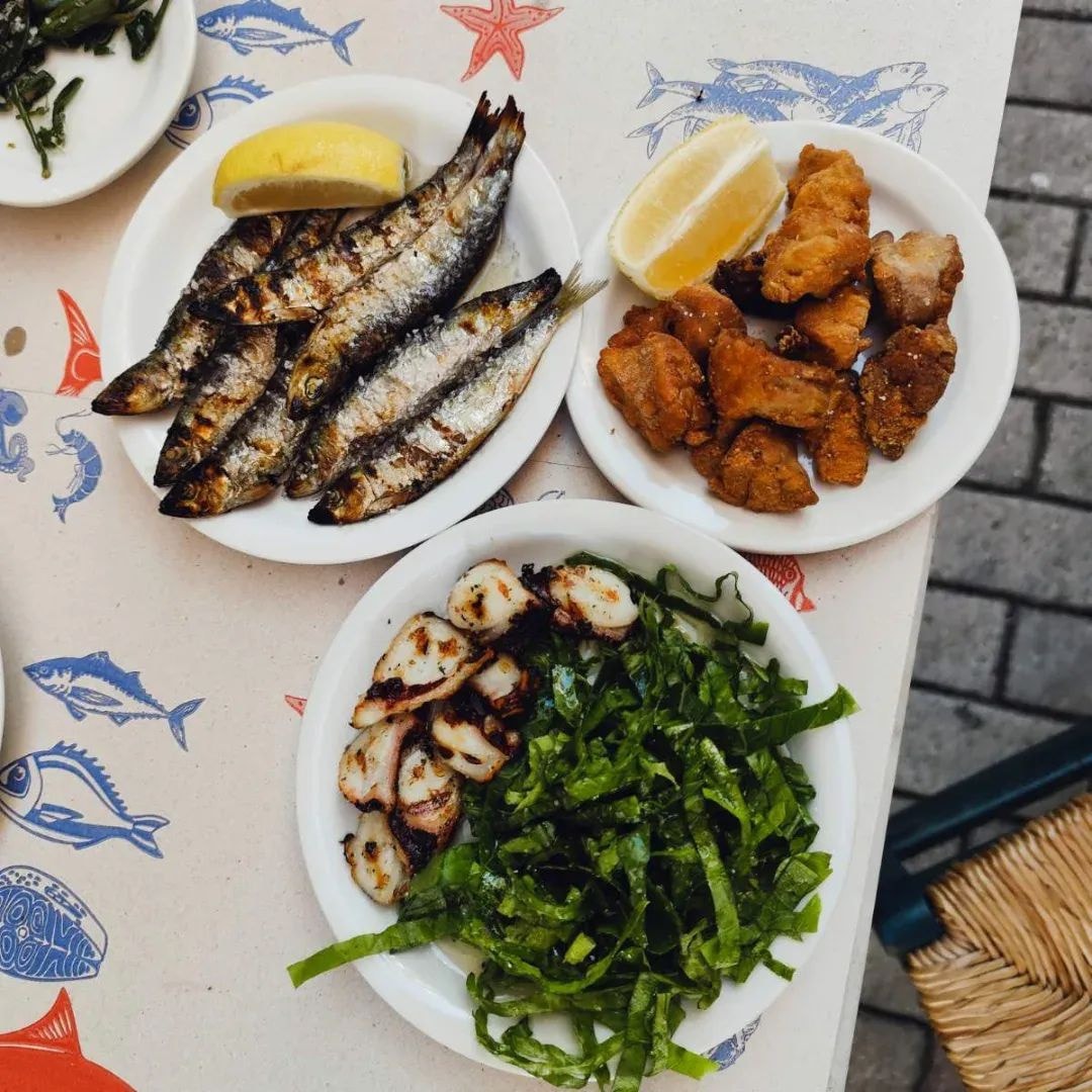 Εδώ όλα ξεκινούν με ένα καθαρό τσιπουράκι, ένα ποτήρι δροσερό κρασί ή μια παγωμένη μπύρα, και συνεχίζονται με φρέσκους μεζέδες που μοσχοβολούν θάλασσα: γαύροι και σαρδέλες,